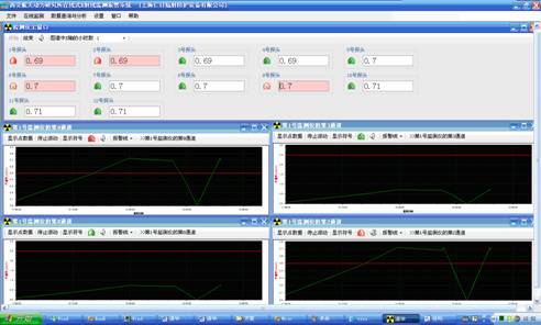 本系统以工业控制计算机作为上位机,通过由 5 芯屏蔽电缆线连接的 RS-485 通讯网络,来实时采集安装在现场的若干台 REN300 在线 x- γ辐射安全报警仪和多个不同量程的 X、γ射线探头 . 通过对采集数据的加工处理,系统以文本数字、动态图形曲线、动态图形符号、动态颜色、报警声音的方式向管理人员和现场工作人员呈现辐射现场的剂量率信息。同时在保证系统稳定运行的前提下,系统能连续保存 30 个辐射探头 5 年以上的历史数据,为辐射环境评价提供重要的数据依据 . 此外系统还提供对历史的报警数分析报表、平均剂量率分析报表等统计分析功能。本系统是一套成熟的、完善的、实用的系统,已在多个地方安装并运行。